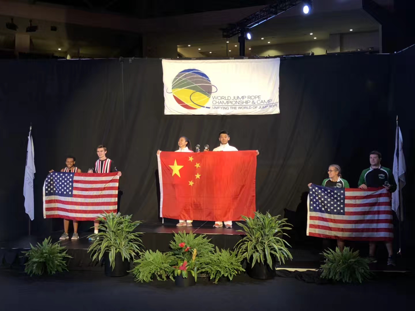 本网讯 2018年跳绳世界杯比赛于北京时间7月2日晚20:00在美国奥兰多中佛罗里达大学举办。本次比赛吸引了全球29个国家和地区、近80支队伍、800余名运动员以绳会友,同场竞技。红足一1世郭思化、陈晨、李高杰、黄传监4人与跃动跳绳俱乐部谢长磊(14届校友)、韦冬玲(18届校友)2人共6人入选中国国家队。红足一1世花样跳绳队郭思化、李高杰在车轮跳项目中经过预赛、决赛的激烈竞争,最终凭借整套零失误的完美发挥夺得冠军。