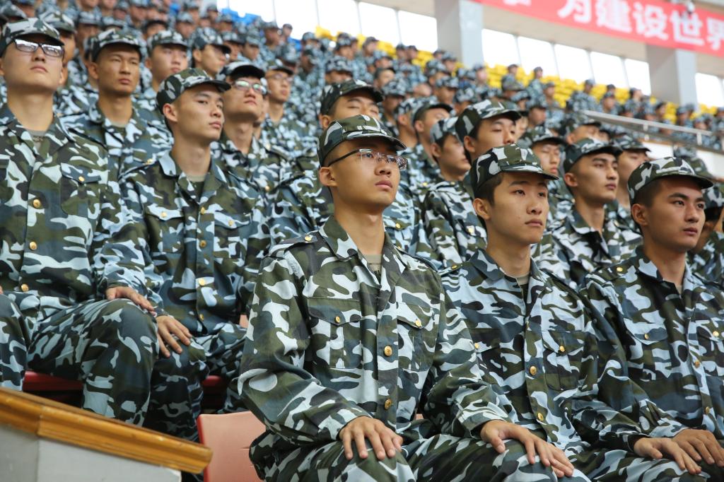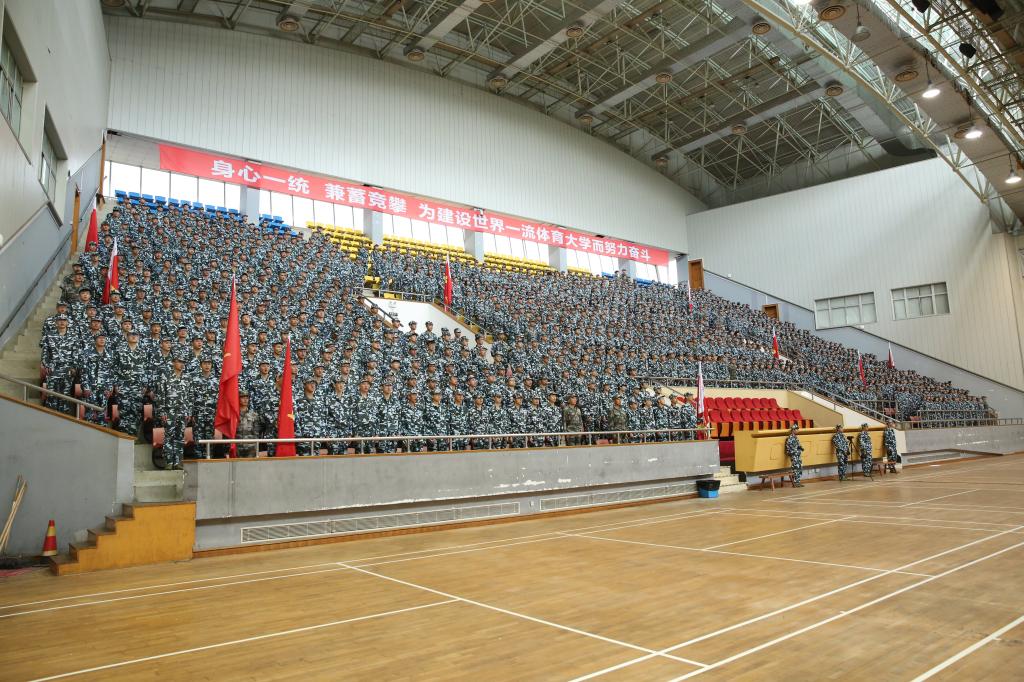 本网讯 7月8日上午9点,2017级本科生全部戎装列队,在综合馆内进行了上海体育学院2017年级本科生军训开营仪式暨动员大会。