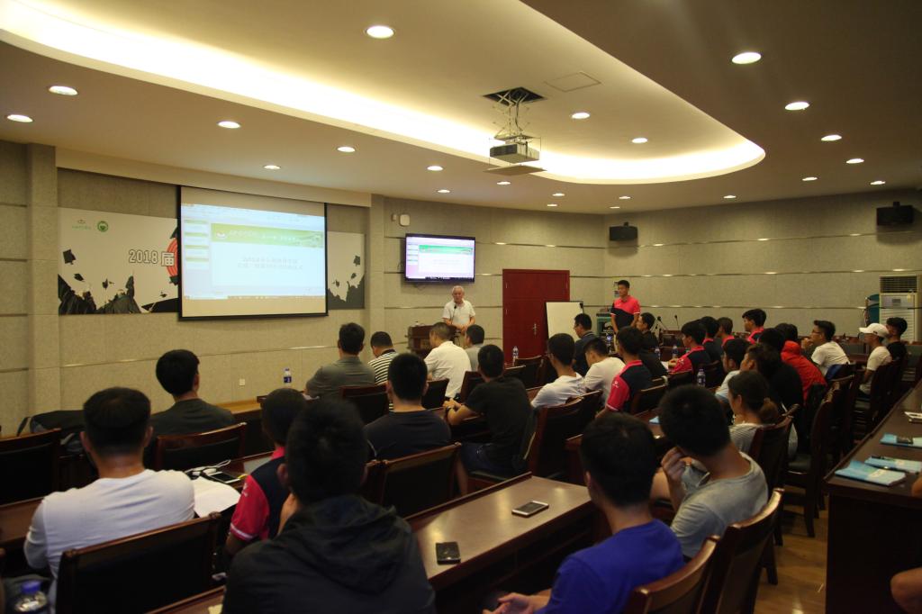本网讯 2018年6月20日,足球裁判实验班培训课程暨年度总结在体训学院1111会议室举行。本次课程总结了裁判实验班成立以来取得的成绩与未来发展的方向。体训学院丁海勇院长、教务处山广处长、竞训科朱昆科长、足球教研团队负责人董众鸣教授、前国际级裁判张忠教授等领导出席,并为今年刚刚晋升为一级裁判的8位同学颁发一级证书。中国足协裁判讲师陶然成教授、国际裁判周飞老师为实验班同学讲授了本年度最后一次培训课程。