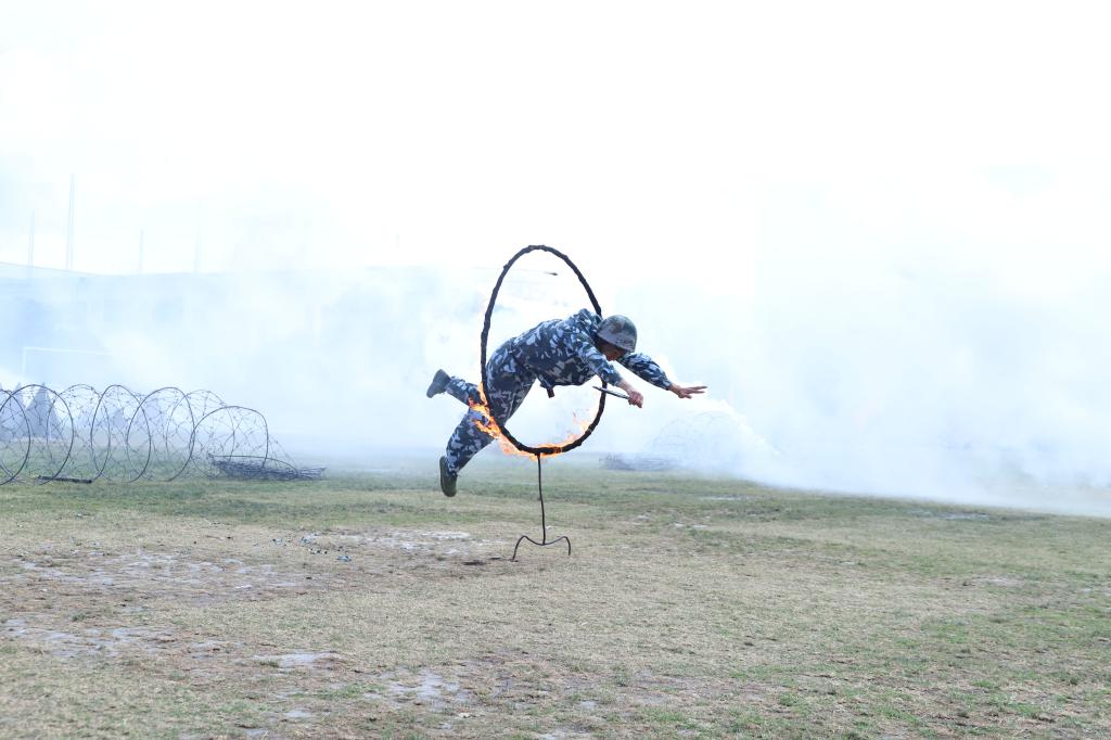 阅兵式后,军训汇报表演开始。首先出场的是女子军体拳方阵,她们气宇轩昂,英姿勃发,一招一式柔中带刚,大有“巾帼不让须眉”的气势。随后是男子刺杀操表演,上体男儿们眼神坚定、招式逼人、喊声响彻云霄,将体育人与军人的正气和霸气完美结合。最后是步兵班进攻战斗演练,战士们脸涂迷彩图案,匍匐前进、钻火圈、搏斗摔跤,再现烽火岁月,展现出勇猛果敢、不屈不挠的顽强意志,博得在场所有人的阵阵喝彩。