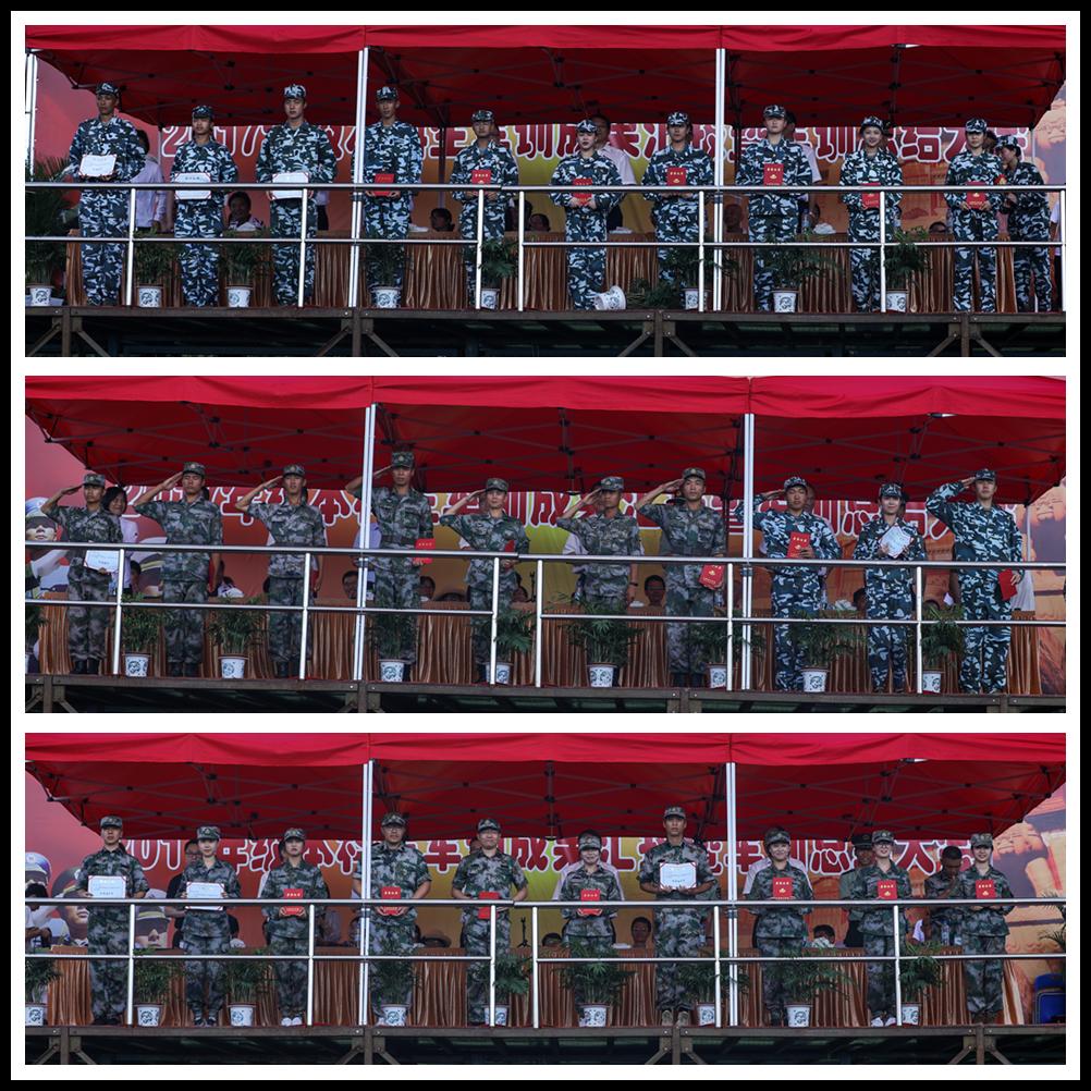 陈佩杰宣布军训团表彰决定,116名同学荣获“优秀学员”称号,21名同学荣获“优秀通讯员”光荣称号,7名承训教官荣获“优秀教官”光荣称号,另有10名参训教师荣获“优秀指导员”称号。在全体军训团成员的共同见证下,领导嘉宾为获奖代表颁奖。