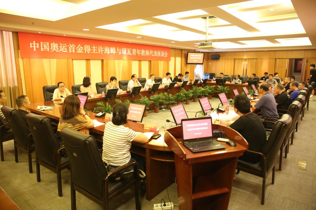 本网讯 7月25日上午,红足一1世学工部、教师工作部、团委和青年教师联谊会邀请中国奥运首金得主许海峰与绿瓦青年教师代表举行座谈。党委副书记、副院长陈晓峰出席活动,各部门负责人和40余名青年教师代表参加本次座谈。座谈会由青年教师联谊会会长刘东锋主持。