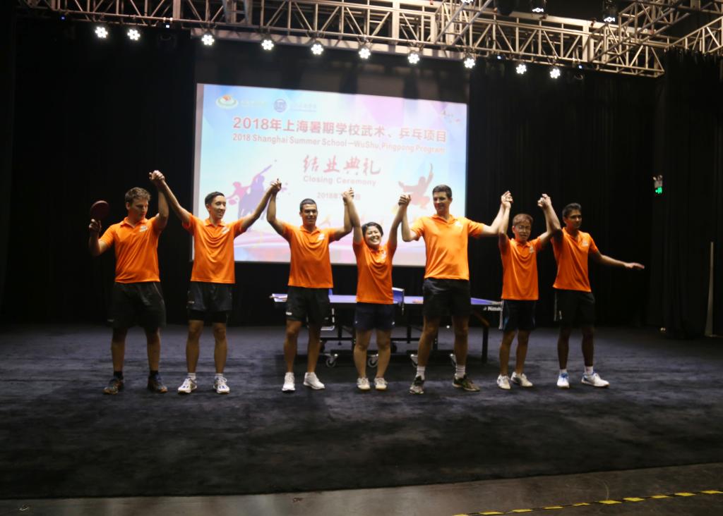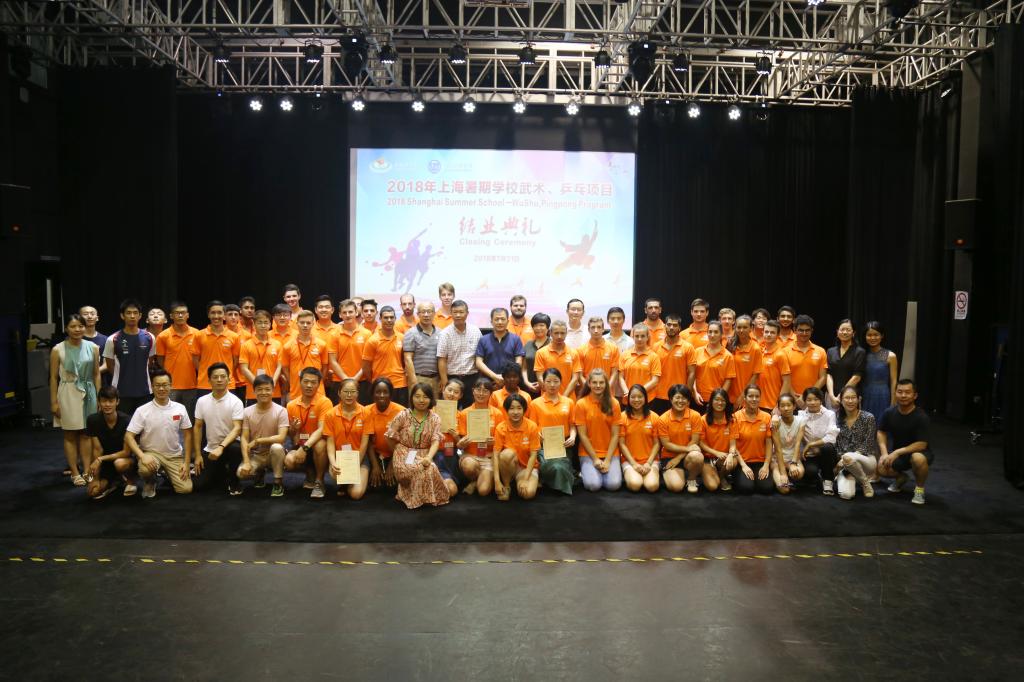 本网讯 7月31日上午,由国际教育学院承办的“2018年上海暑期学校武术、乒乓项目”结业典礼在黑匣子剧场举行。上海体育学院副院长王兴放、中国乒乓球学院副院长李汶凯、国际教育学院院长吴贻刚、国际交流处处长户进菊、教学训练保障中心主任王继红、党委宣传部副部长黄勇出席结业典礼,国际教育学院副院长朱东主持仪式。国际教育学院、中乒院、武术学院教师,本期学员和志愿者们参加典礼。