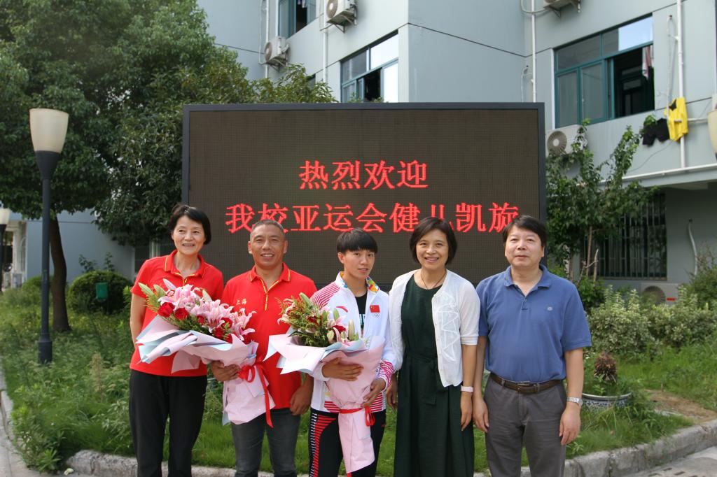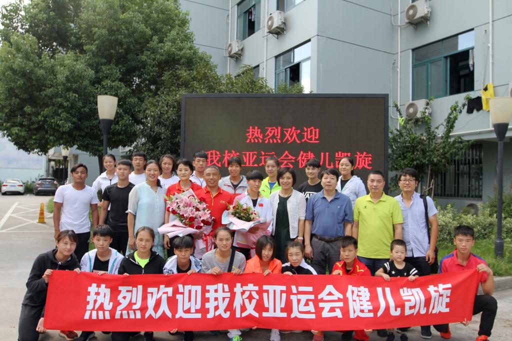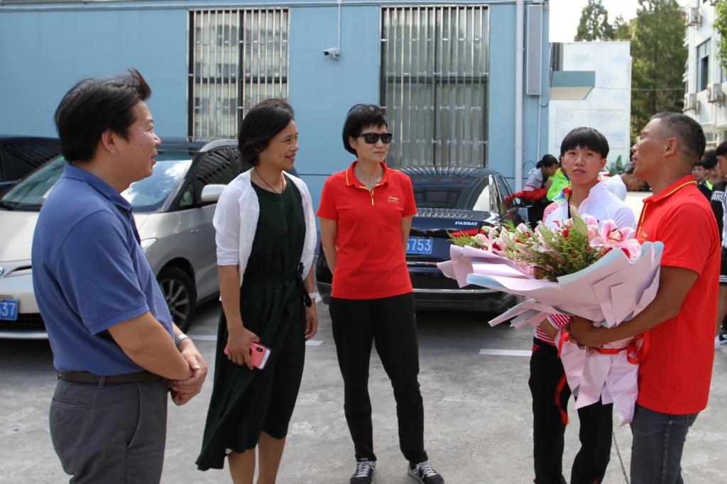 本网讯 27日下午,雅加达亚运会女子散打60公斤级冠军蔡颖颖载誉归来,学院副院长毛丽娟和竞校领导班子迎接并慰问蔡颖颖及其教练员沈学军。竞校相关人员及女子散打队全体队员参加迎接活动。