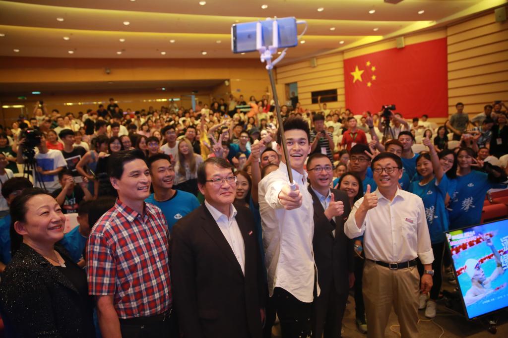 活动中,孙杨回忆了从08年第一次参加奥运会到今天成就泳坛的全满贯的历程,他谈到了过程中的挑战与困难,也分享了那些荣耀背后不为人知的艰苦和努力,并表达了对大学博士学习和生活的期待。