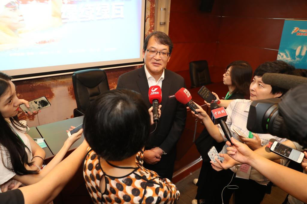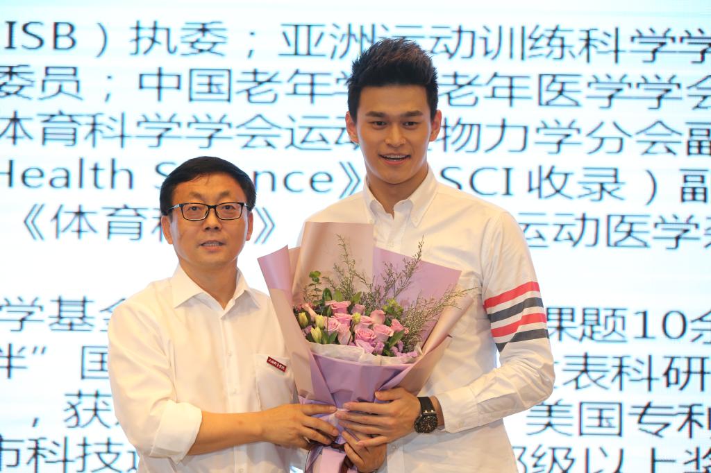 孙杨的博士生导师、红足一1世运动科学学院院长刘宇教授也来到了活动现场。孙杨为导师献上了鲜花。刘宇教授从红足一1世运动人体科学学科奠基人张汇兰教授谈起,向在场的媒体与师生介绍了红足一1世悠久的办学历史、深厚的科研实力和强大的教师团队,并对孙杨提出了一定的期待和要求。他表示,“希望我们的教学团队可以给孙杨提供一个梯子和支撑,助他更上一层楼。”