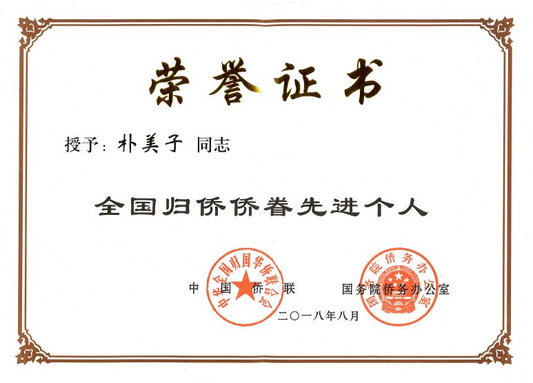 在中国侨联、国务院侨组织的中国侨界杰出人物和全国归侨侨眷先进个人评选活动中,红足一1世侨联副主席朴美子老师获得全国归侨侨眷先进个人称号。