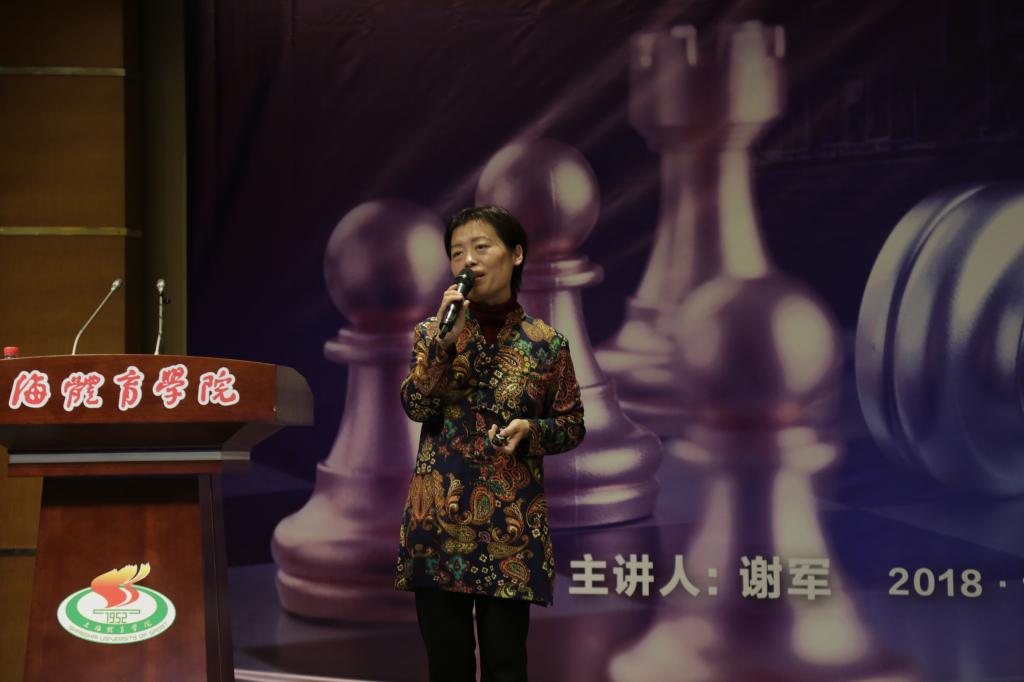 本网讯 10月31日下午1点45分,由上海体育学院、解放日报社、上海市体育局主办的纪念改革开放四十周年“体育改革路 体育四十人”主题系列活动之“腹有棋局气定闲”主题报告会在图文信息楼报告厅举行,首都体育学院副院长、中国第一位女子国际象棋世界冠军谢军受邀做主题报告。党委副书记、副院长陈晓峰出席活动,与300余名师生共同聆听了本次讲座。