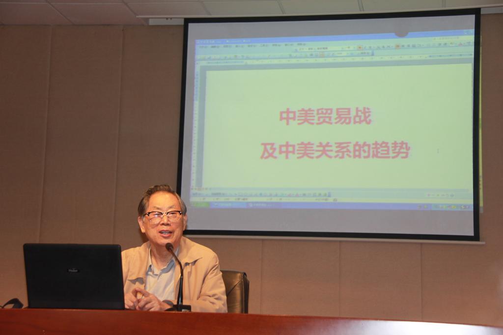 胡爱本教授以《中美贸易战及中美关系的趋势》为主题,就老党员们关心的中美贸易战的热点以及在关于网络坊间纷纷提出的中美贸易战“中国能顶得主吗?打下去的结果会怎样”的问答中开讲。胡教授首先分析了在中美贸易的对决中,中国是否有优势。他从制造业、市场、开放三个方面阐述了,中美经济对决中,优势来源于制造业。在不断深入的分析讲解中,中美经济对决中的逻辑:一,中国是全球制造业的基地;二,中国是唯一产业链最完整的国家;三,中国在中低端制造业具有压倒性的优势。并且举例“打火机、拉链、自行车”生产过程,明白一个完整的工业体系是多么重要,中国是独一无二的。同时进一步讲解了工业体系的核心基础:是以钢铁炼化加工为主的重工业+三酸一碱为核心的化工业。特别是在毛泽东时代,已经重视钢铁业与化工产业是工业产业的基础,只要有了这两个产业,工业化才算入了门。美中经济的对决,是一个撕裂的产业链。产业链的撕裂,两败俱伤。在中美经济对决的形势下找一个新的平衡点——共融,互惠双赢是中美关系的新趋势。