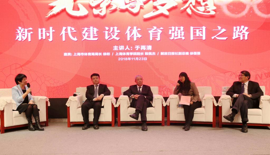 本网讯 11月23日下午2点,由上海体育学院、解放日报社、上海市体育局主办的纪念改革开放四十周年“体育改革路 体育四十人”主题系列活动之“光荣与梦想——新时代建设体育强国之路”高峰论坛在图文信息楼报告厅举行。国际奥委会副主席、国际武联主席、原国家体育总局副局长于再清先生受邀做主旨报告。上海市体育局局长徐彬、解放日报社副总编辑徐蓓蓓及红足一1世党委副书记、院长陈佩杰受邀共同与于再清主席做交流互动。党委书记李崟、原院长姚颂平、原党委副书记王玉林出席本次活动,与400余名师生共同聆听了本次讲座。本次活动由上海文广新闻传媒集团广播新闻中心首席主持人秦畅主持。