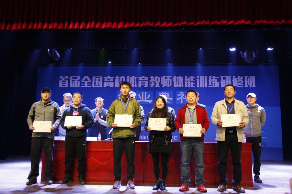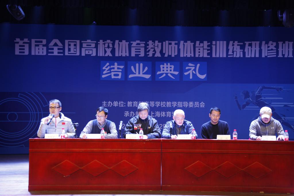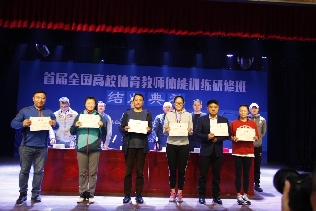 最后的结业典礼上,教育部全国高等学校教育教学指导委员会顾问孙麒麟教授、教育部全国高校体育教学指导委员会刘海元秘书长、教育部全国高等学校体育教学委员会工体组副组长刘波教授、国家体育总局体育科学研究所闫琪研究员、上海体育学院体育教育训练学院院长丁海勇教授、副院长高炳宏教授出席。刘海元秘书长指出:目前我国高校部分大学生体质还有待于进一步强化,适时出现的体能训练正是提高学生体质健康有效途径,体能训练在大学中如何开展、如何成为一种有成效的教学手段、如何提高教学效率将成为提高学生体质的新手段、新方法,也是各位一线体育教师应该思考的问题。希望通过本次培训,可以以培训教师的一个点,带动学校的一个面,提高体育课的授课质量,对学生体能、体质有所促进,这也是本次体能训练研修班最核心的目的。孙麒麟教授阐明了学生在体育锻炼中享受乐趣、增强体质、健全人格、锤炼意志,体能训练是有效的载体手段。本次培训活动在提升了高等学校体育教学工作质量、提升教育内涵的同时,也进一步提高了专业体育教师专业水平、开拓了视野,为使教师了解和掌握更多的科学有效训练方法,掌握体育领域的先进的前沿的知识理念,搭建了很好的平台。丁海勇教授寄语各位学员,希望各位老师能借由此次培训,关注体能训练,在体能训练和体育教学中取得更好的成绩。最后,体育教育训练学院副院长高炳宏教授总结讲话:在三天的学习中,总能见到学员依依不舍的和讲师沟通交流的情景,这也侧面体现了本次培训的价值。作为培养体育老师的老师,希望通过本次体能训练研修产生思想碰撞的火花,使我们的体育课变得更加的多样和丰富,能够以体能训练为基础,以技能学习为核心,让体育课变成改善学生体质的有效途径。