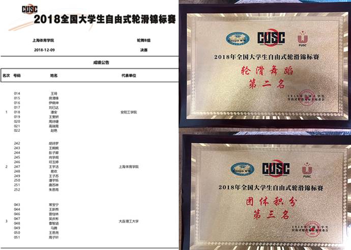 上海体育学院代表队在本次赛事中获得了团体总分第三名的佳绩,并荣获道德风尚奖。经管学院学生潘宇烁连续三年获得报名组别速度过桩、花式绕桩的金牌;休艺学院朱思雨、彭子卿、胡诗梦等学生获得了轮滑舞蹈项目7人以上组别的亚军。休艺学院轮滑舞蹈队队员易欢、尚学炎两人获得了优秀运动员称号。