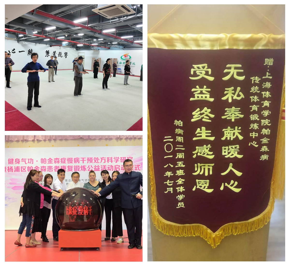 “帕金森康复训练营”是武术学院王震老师和他的研究生志愿者们在2016年6月2日创办的,运动科学学院庄洁老师和韩甲老师先后加入了这个公益活动,这个活动还得到了新华医院神经内科主任刘振国教授团队的大力支持。该项目从中国传统体育文化出发,主要从国家体育总局推广的健身气功中选取了若干针对帕金森患者病理症状编制的运动处方进行锻炼。以科学的数据与技术运用到帕金森患者的康复锻炼中,累积服务人数达到300余人,取得了显著成效,受到帕友们的认可。