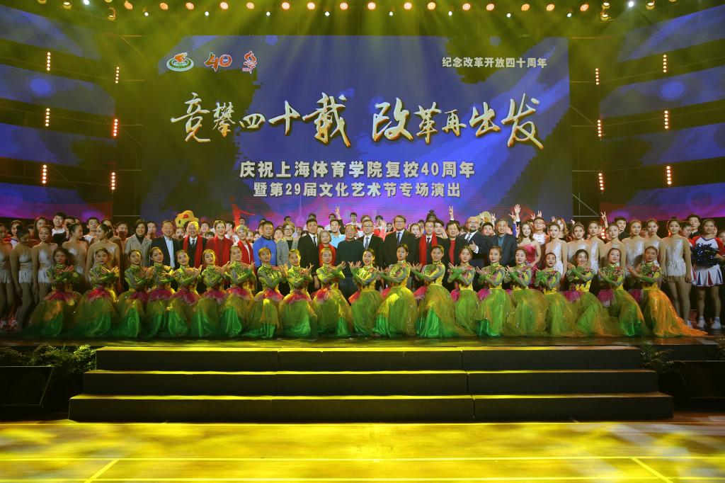 本网讯 1978年正值中国实行改革开放,上海体育学院于清源环路校址挂牌复校。绿瓦人竞攀四十载,与祖国同命运,与时代共步伐,紧跟改革再出发,与中国体育的发展紧密相连。12月19日晚,“竞攀四十载,改革再出发”——庆祝上海体育学院复校四十周年暨第二十九届文化艺术节专场演出在红足一1世综合馆隆重举行。党委书记李崟,党委副书记、院长陈佩杰,党委副书记、副院长陈晓峰,党委副书记、纪委书记詹萌,党委副书记潘勤,党委副书记、院办主任杨玲,副院长毛丽娟,副院长王兴放出席此次活动并观看了演出。