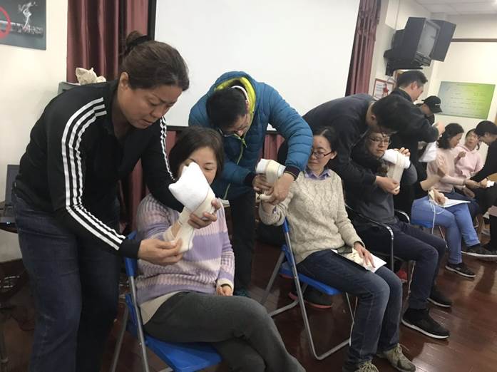 21日的讲座主要讲述了包扎伤口以及搬运伤员等基本知识。围绕五种绷带包扎以及四大类的三角巾包扎的方法,培训教师运用具体事例向学员们讲述搬运和骨折现场处理的注意事项。观看过专业的示范动作后,学员们两人一组进行模拟练习,场面十分活跃。最后进行了红十字救护员的理论考试与实践考试,学员们努力记背相关知识,各自都取得了优异的成绩。