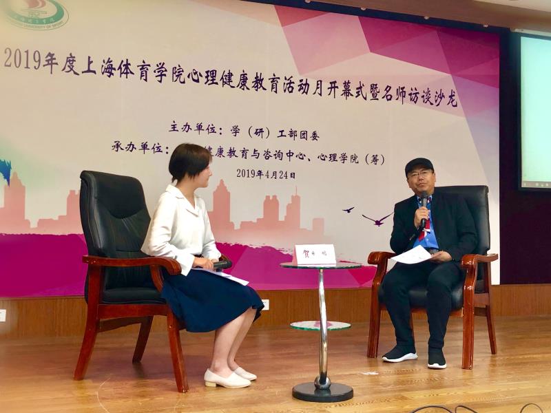 本网讯 4月24日下午,“2019年度上海体育学院心理健康教育活动月开幕式暨名师访谈沙龙”在学生活动中心报告厅举行。学(研)工部部长梅朵,心理学院(筹)党总支书记刘宏、教授贺岭峰等出席活动。