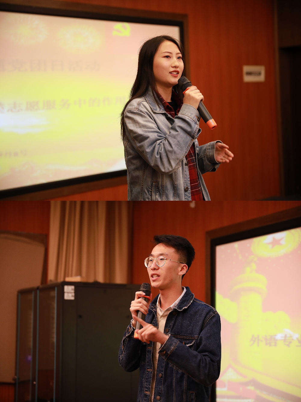 原溶作为多次带队参加志愿活动的教师也谈了自己的亲身感受。他看到了志愿服务的不易,多数的志愿活动都是时间紧任务重的,但他为同学们都能出色地完成各项任务感到自豪。原溶是学英语出身的,在他看来,“体育+英语”的发展模式将成为体院外语系学子成才的重要途径,他希望外语专业的党团员同学们能主动对接社会的需求,明确努力方向,发挥专业优势与体育特色,牢记作为青年的社会责任感与历史担当,能够成为对家庭负责、对社会有益的德智体美劳全面发展的新青年。