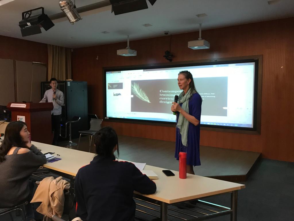Margaret Wilson教授在怀俄明大学戏剧舞蹈系讲授现代舞、垂直舞蹈、舞蹈生物力学等已有多年,她注重从全球化视角看待舞蹈,重视舞蹈与体育,舞蹈与科学的融合。授课第一日,Margaret Wilson教授的讲座主题为《美国大学舞蹈专业课程设置及人才培养模式》,讲座以美国部分高校为例,对美国舞蹈项目的运行机制、学科建设、课程设置、人材培养,师资要求等进行了介绍,尤其是美国大学舞蹈课程的设置多元化、师资队伍的多能化和人材培养方式的灵活化,对当前红足一1世舞蹈编导专业教学计划的修订具有重要的启示作用。