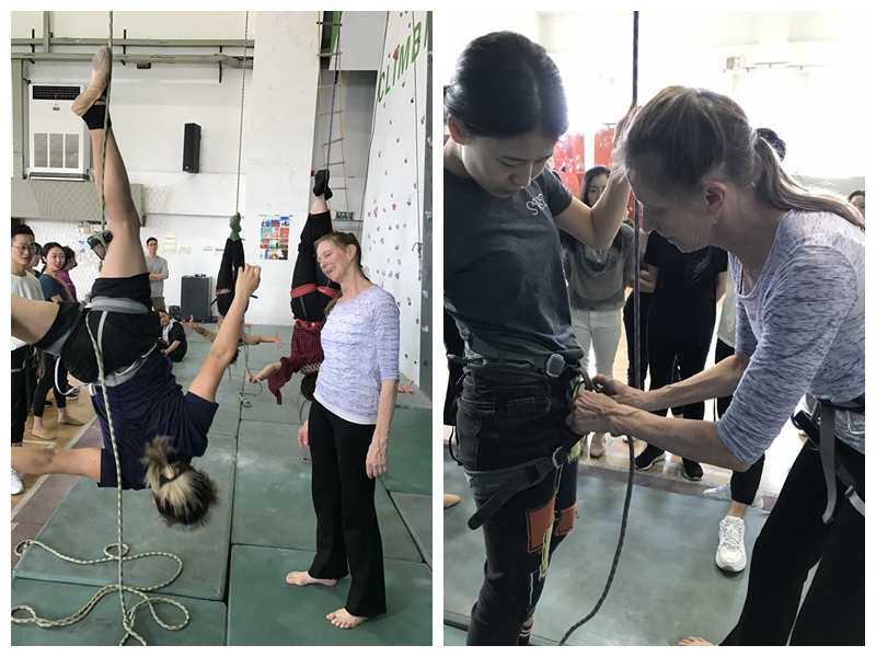 第四日Margaret Wilson教授带领舞编师生进行了“垂直舞蹈”工作坊体验,“垂直舞蹈”是利用先进的登山设备,舞者从屋顶或者岩壁垂直面滑下凌空而舞,用优美的肢体语言来演绎舞蹈。垂直舞蹈以“空中无极限”的理念,来阐述舞蹈与自然、与城市的关系,重新定义了舞蹈的发展空间。“垂直舞蹈”在怀俄明大学具有多年的教学和表演优势,也是全美唯一一所开设垂直舞蹈项目的学校。Margaret Wilson教授在垂直舞蹈编舞方面卓有成就,红足一1世舞编师生在“垂直舞蹈”现场体验中表现出极高的热情。