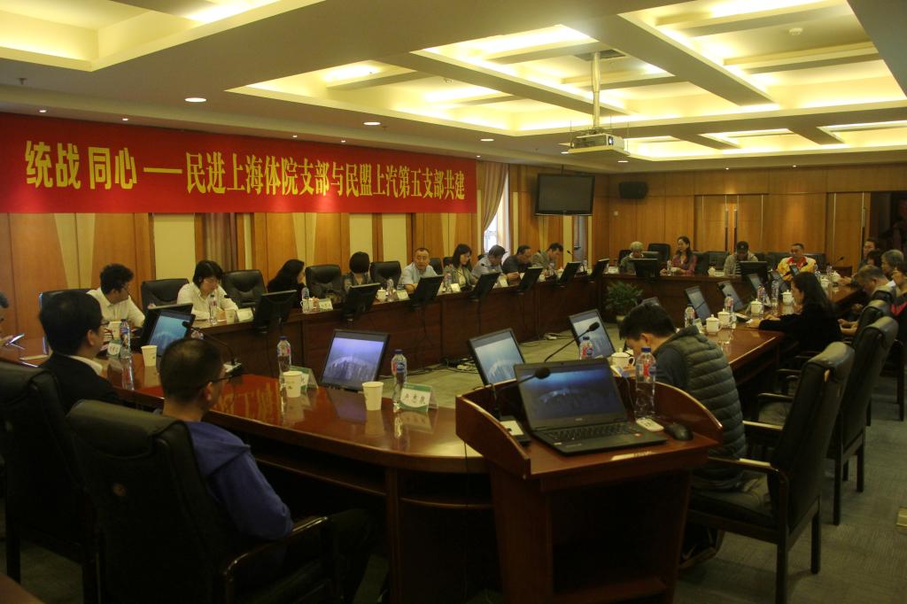 本网讯 5月17日上午,民进上海体院支部与民盟上汽第五支部在上海体育学院图文信息楼第一会议室联合开展“统战、同心”共建交流活动。上海体育学院统战部部长王继红、上汽大通集团统战负责人肖利主任、民盟上汽第五支部主委赵君石,以及民进上体支部会员、民盟上汽第五支部盟员近40位同仁共聚一堂。会议由民进上海体院支部主委吴坚编审主持。