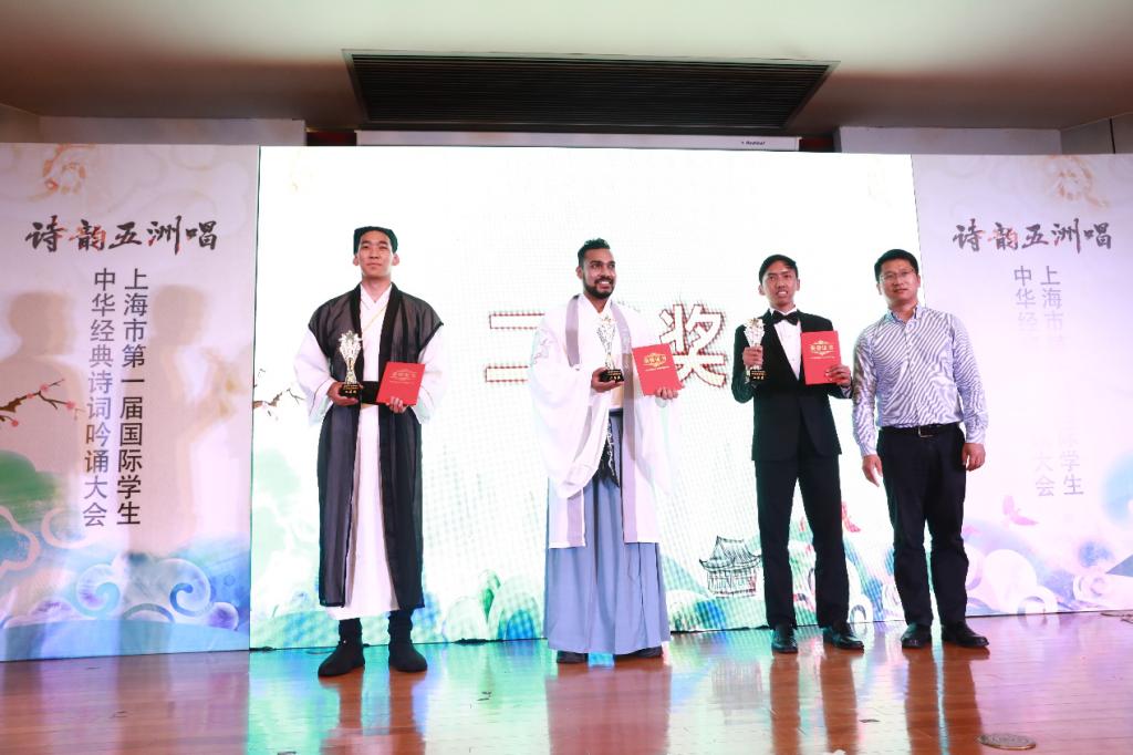 比赛过程中,学生们一丝不苟,艾玉和吴悦儿发音标准,唱功震惊四座,阮维南、大龙的改良太极拳与佐藤、艾玉的太极剑术表演独具体院特色,诗歌吟唱与伴舞刚柔相济,相得益彰,在座评委们纷纷竖起大拇指。最终,红足一1世留学生获得了上海市首届国际学生中华经典诗词吟诵二等奖,收获了一份不小的惊喜。