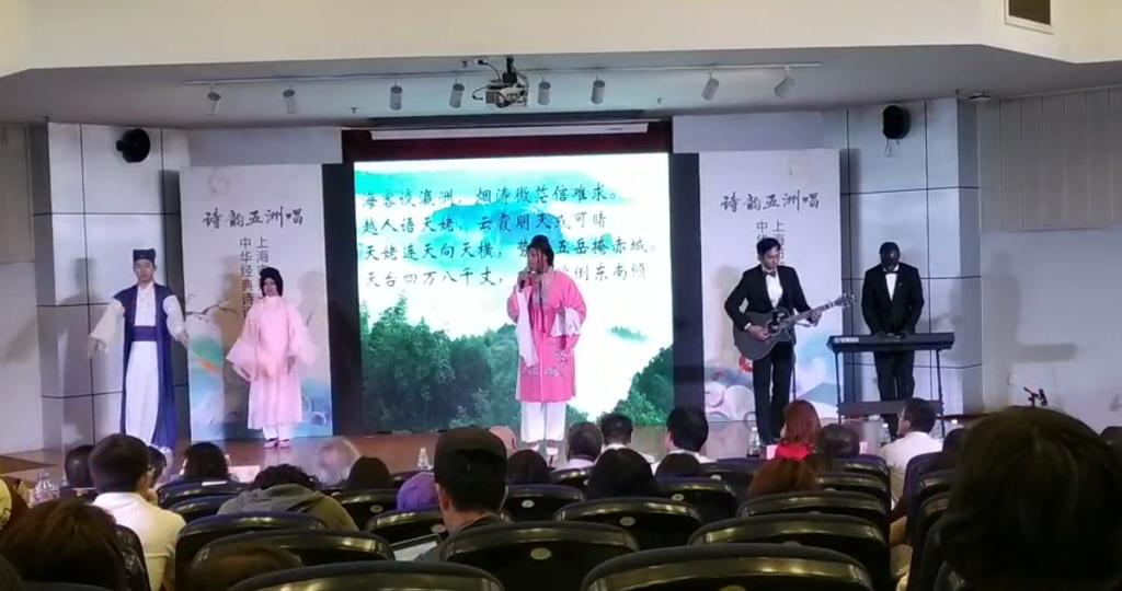 本网讯 2019年6月6日,由上海市高校外国留学生教育研究会、上海大学主办、上海大学国际部国际教育学院承办的“第一届上海国际学生中华经典诗词吟诵大会”在上海大学宝山校区隆重举行。活动特邀上海杨浦区教师进修学院教授刘德隆、扬州大学教授刘勇刚、上海音乐学院研究员杨赛、首都师范大学老师朱立侠、国家一级播音员白鹭五位吟诵专家作为评委莅临指导。上海市外国留学生教育研究会秘书长、上海财经大学国际文化交流学院院长孙冰教授进行开赛致辞。参赛大学有复旦大学、上海交通大学、华东师范大学等18所高校。红足一1世国际教育学院的越南、多哥、刚果(布)、印尼学生联合组队,积极参加了这次比赛。
