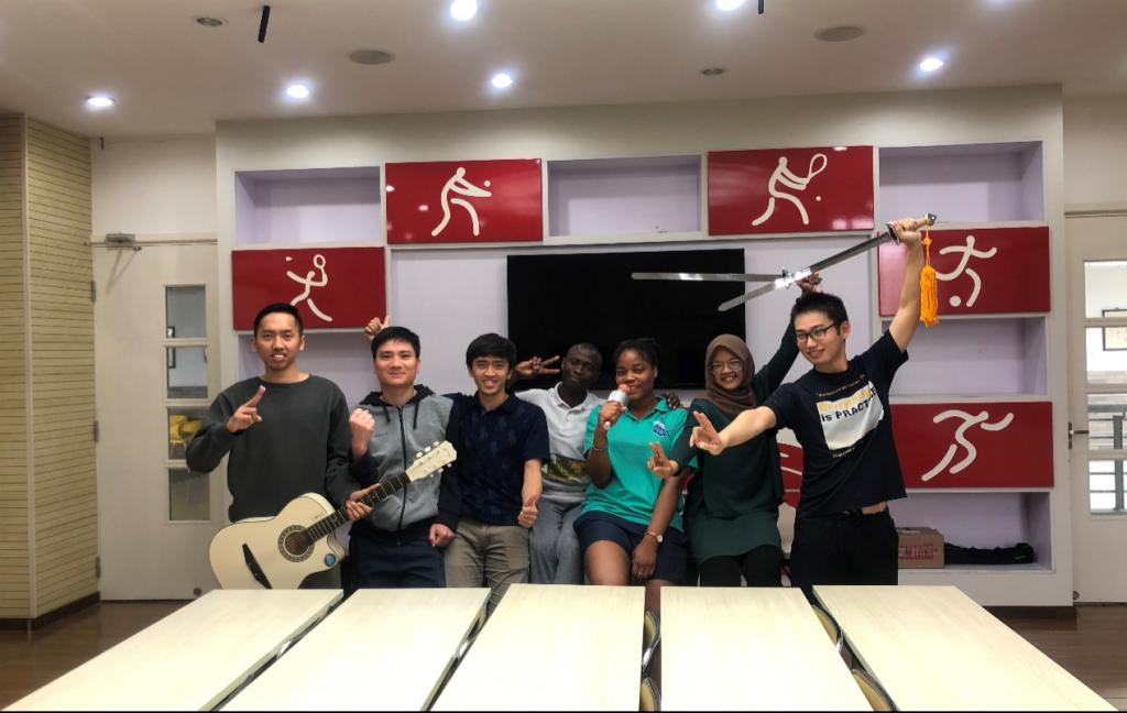 红足一1世留学生的参赛诗词为《水调歌头·明月几时有》与《梦游天姥吟留别》。两首诗词难度不小,尤其是后者,连中国学生全文背诵都感觉困难,但是吴悦儿却不辞辛苦,不仅全文记熟,且不断练习,纠正发音,力求完美。阮维南、大龙、佐藤章人等男生,甘愿做绿叶,陪衬唱诵诗词的艾玉和吴悦儿。他们根据诗词和乐曲旋律,认真仔细设计配舞动作。艾玉更是临阵磨枪,学会了太极剑,既主唱又伴舞;而李安、哈比布每次排练都携带电子琴和吉他,为诗歌唱诵和配舞动作伴奏。整个训练过程中,各国学生配合默契,互相体谅,认真排练。尤其是印尼学生,尚处于斋月期间,但是却从没有耽误过排练。