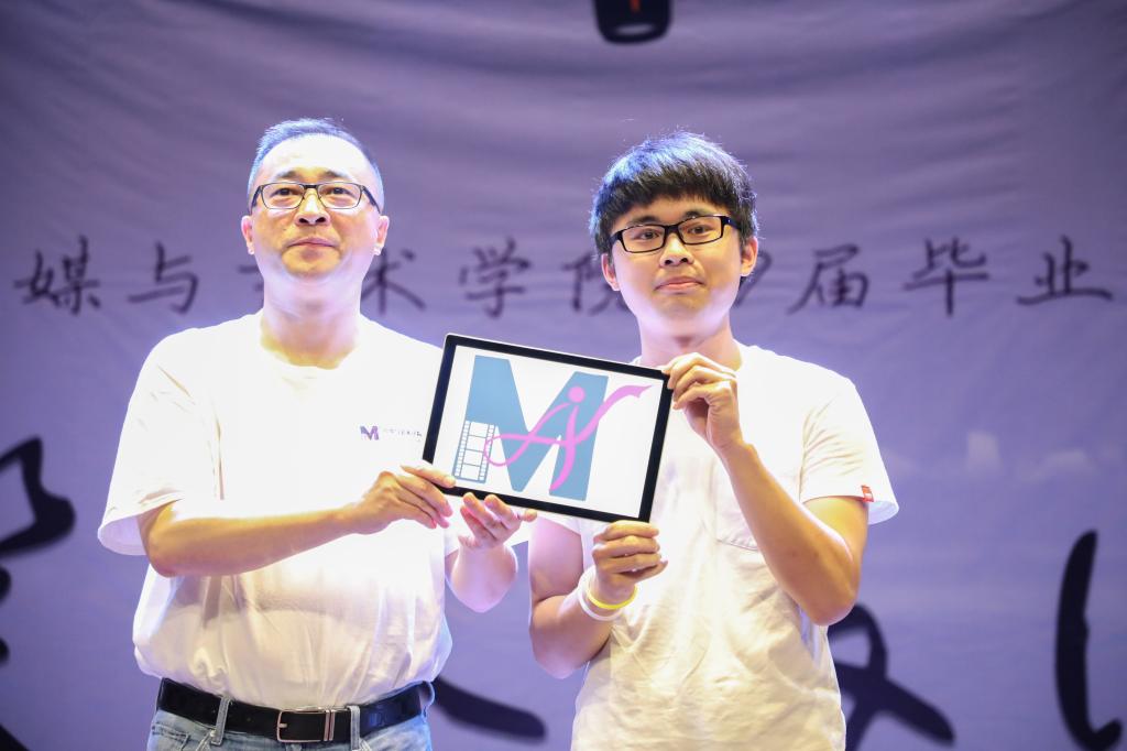 党委书记李崟上台为传艺学院揭幕学院新logo,该logo由16级新闻专业学生杨一江同学设计,他阐述了自己的构思,大写字母M代表media,即媒体,舞动的丝带代表舞蹈编导专业,即艺术。Logo在色彩上用靓丽的粉色加以点缀,代表了传艺学子的青春活力。李崟书记表示,这个logo的设计非常别致、有意义,可以看出杨一江同学创作时很用心。李书记亲切寄语传艺学子,鼓励大家只要努力付出,一定能收获意想不到的惊喜。李书记致辞道,传媒与艺术学院是一个充满艺术人文气息的朝气蓬勃的学院,希望毕业生们带能够把这四年来,学习到的顽强拼搏,兼蓄竞攀的体育精神,带入到以后的工作和生活中去,不辜负母校的培育与期望。