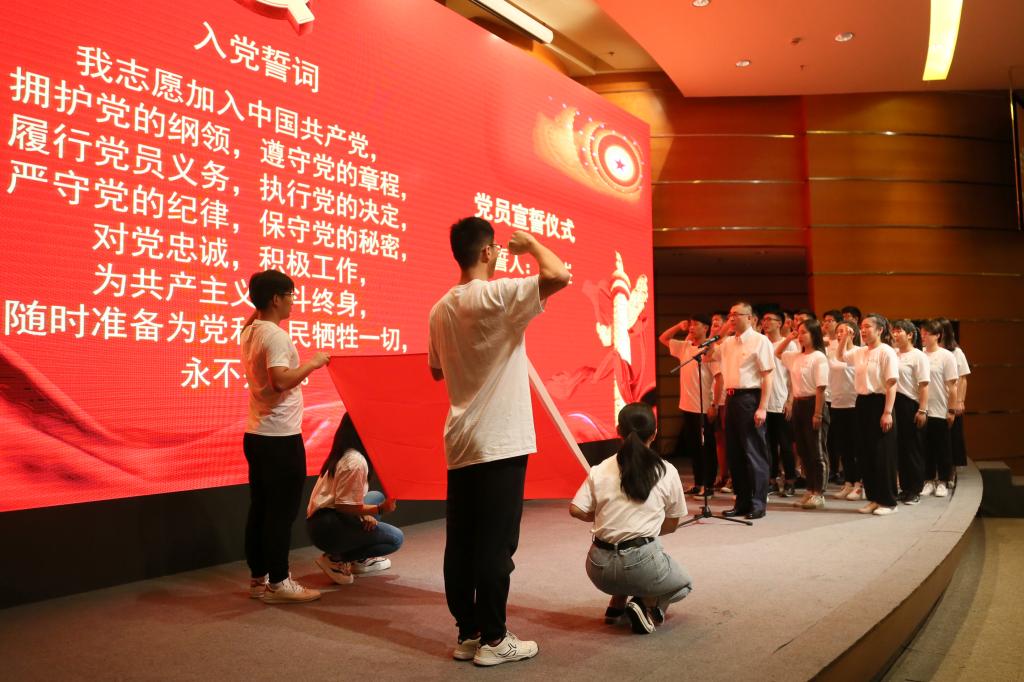 会上,党委书记李崟领誓,新发展的学生党员面向党旗庄严宣誓。在场的全体党员一起重温入党誓词,牢记入党初心。