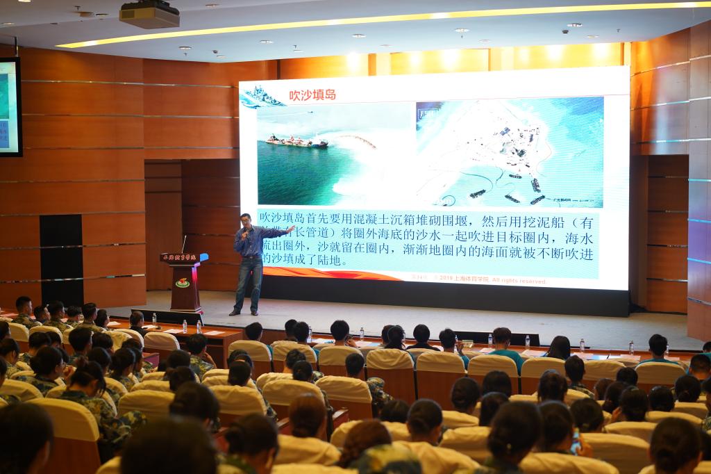交流会在庄严的国歌声中拉开序幕。国防教育是按照捍卫国家主权和领土完整防御外来的侵略,维护世界和平的目的要求,对公民的品德、智力和体质等施加相应影响的一种有计划的活动。张晓龙老师从“提升海洋意识”、“关注海洋国情”、“创新国防观念”三个方面为同学们上了一堂国防教育微课。张晓龙表示,现代国防既是以军事、经济、科技为主的硬实力的竞争,同时也是制度、观念、文化、民族精神等软实力的竞争。随后,他号召全体师生要创新观念,牢记几个重要纪念日,以身作则,保护我国在世界各地的利益。