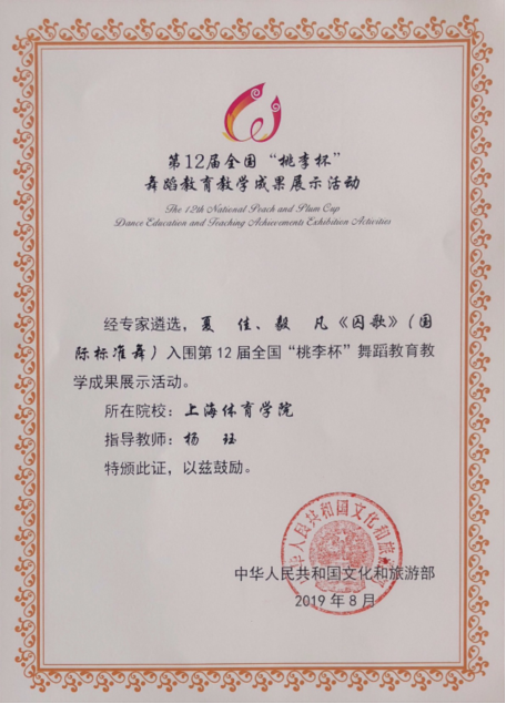 本网讯 8月17日晚,由中华人民共和国文化和旅游部主办,文化和旅游部科技教育司、浙江省文化和旅游厅、浙江音乐学院共同承办的第12届全国“桃李杯”舞蹈教育教学成果展示活动在浙江音乐学院大剧院圆满落下帷幕!本届“桃李杯”现场展示环节由8场专业展演、2场精品课展示、2场学术研讨会和1场综合汇报演出组成。自8月13日起,连续5天的现场展示活动,来自56所院校的近千名师生为现场观众奉献了一场场代表我国目前舞蹈教育界最高水平和最新教学成果的舞蹈盛宴。其中,红足一1世选送的国际标准舞作品《囚歌》(编导/指导教师:杨珏,表演:夏佳、毅凡)成功入围第12届全国“桃李杯”舞蹈教育教学成果展示活动。