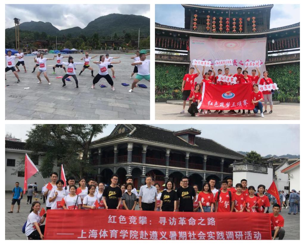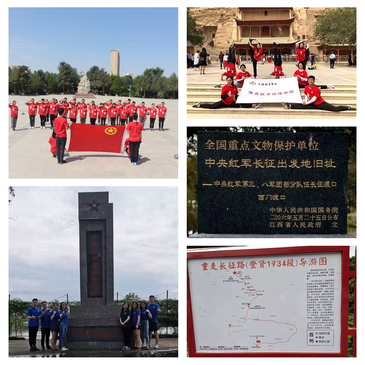 上海体育学院在今年结合“不忘初心、牢记使命”主题教育,大力推动“五星五环五情”,在暑期社会实践活动期间,多支团队用脚步丈量神州大地,保持“使命在肩,奋斗有我”的精神状态,践行新时代青年的理想抱负,传递体育精神与力量。如上海市2019年“互联网+”金奖项目——《井冈会师路红色传承旅》项目践行用体育的力量实现精准扶贫和乡村振兴,打造参赛者最多,关注度最高,最适合乡村发展的赛事群,立足红色革命老区,开发推广红色定向跑、山地车、攀岩为内容的红色筑梦三项赛。红足一1世学生还赴红军长征出发地——江西于都,为红色旅游资源开发工作寻找有利的利用资源;在安徽金寨,深入走访革命老区,调研当地体育资源的发展、体医结合的现状和建设情况;在山东泰安,探寻山东泰安红色足迹,传播新时代中华武德的优秀内涵和优良传统。