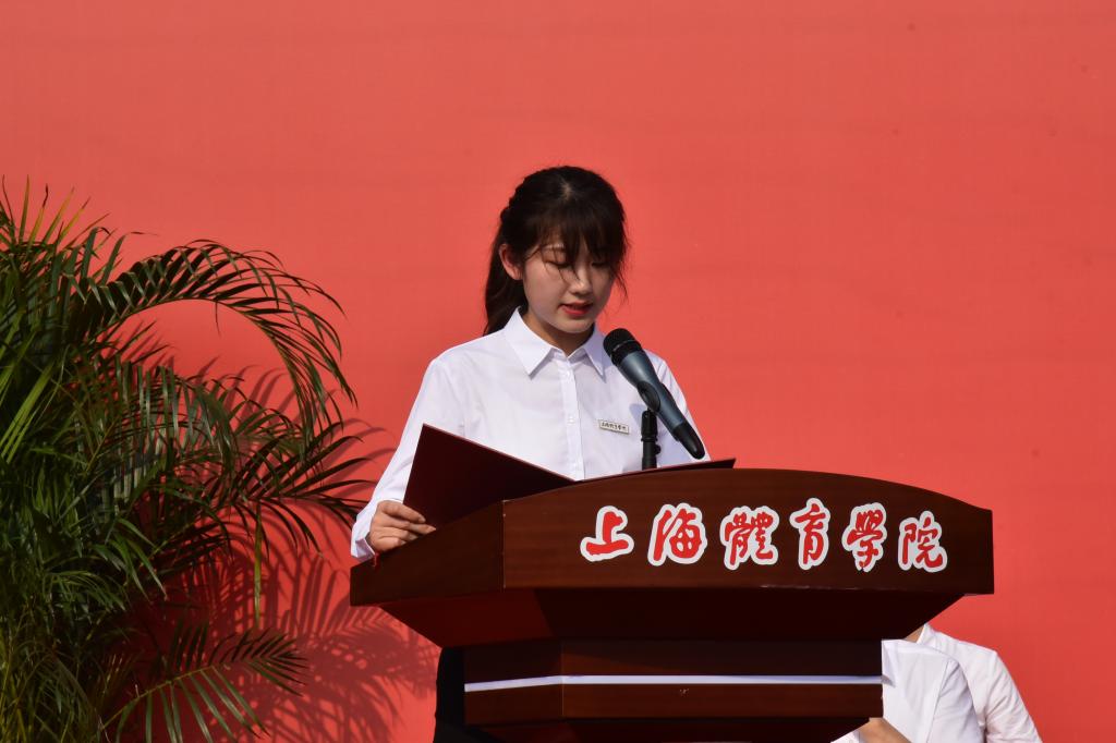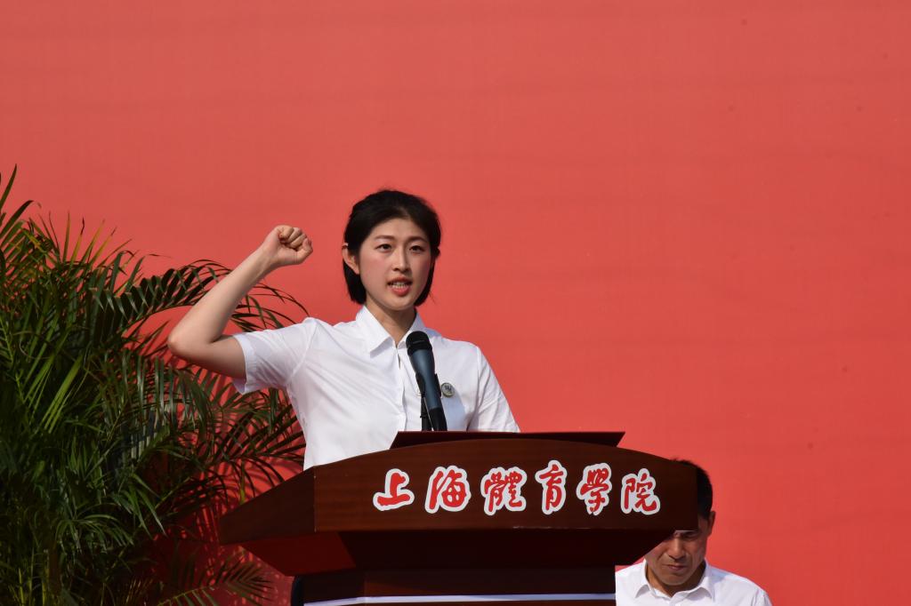 校学生会主席王一凡代领全体新生共同庄严宣誓:身心一统,兼蓄竞攀。践行校训精神,追寻先辈们的足迹;使命在肩,奋斗有我。践行竞攀精神,高举体育强国的旗帜;追寻初心路,践行中国梦,为建设世界一流体育大学而不懈奋斗,为实现中华民族伟大复兴而努力奋斗!