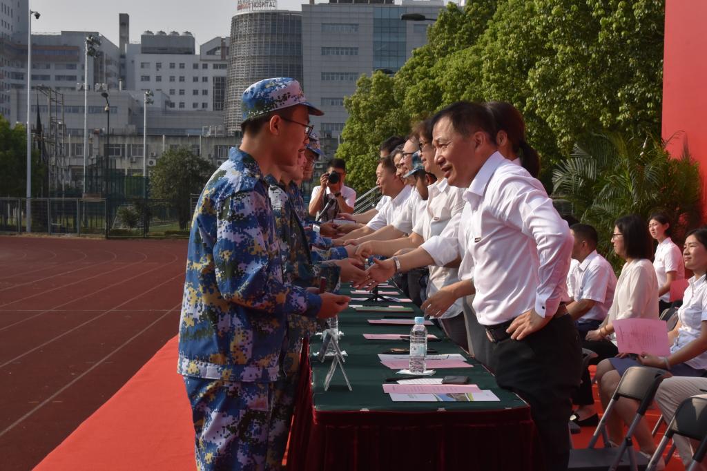 大会上,校领导为2019级新生代表授予象征学校的校徽。