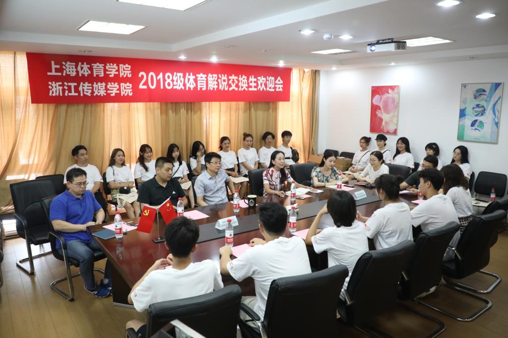 本网讯 9月10日下午,正值2022杭州亚运会开幕倒计时三周年之际,浙江传媒学院18级体育解说交换生一行来校学习,传艺学院召开欢迎会。传艺学院院长杜友君,教务处副处长朱昆,传艺学院副院长韩春英,党总支副书记、副院长陈怡,播音主持专业负责人朱俊河,浙传18级体育解说班带队老师吴景美出席会议。会议由传艺学院18级本科生辅导员丁勇尧主持。