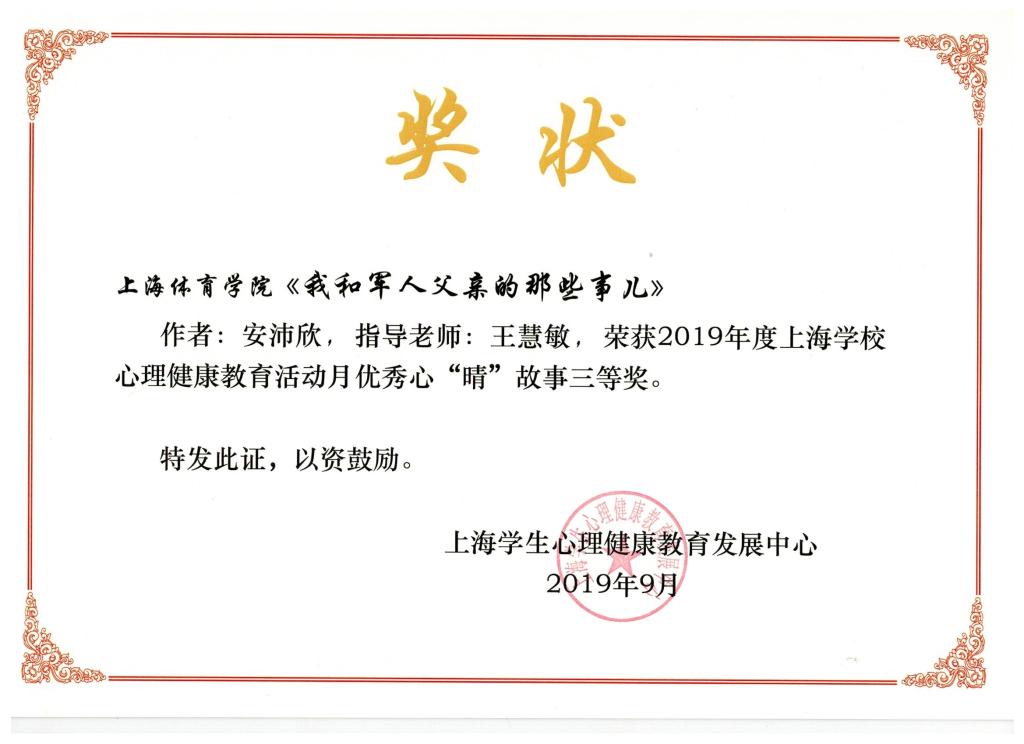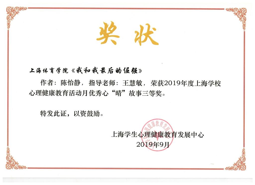 本网讯 9月25日,2019年度上海学校心理健康教育活动月总结表彰会在上海大学举行。此次活动月的特色项目为“我的国·我的家,我的“心‘晴’故事”征文活动,每所高校最多推选三篇参赛,活动共收到全市各高校参赛稿100多篇,55篇获奖,红足一1世选送的三篇征文均荣获三等奖,分别是心理学院何亚平撰写的《樱花泪》;传媒与艺术学院安沛欣撰写的《我和军人父亲的那些事儿》;运动科学学院陈怡静撰写的《我和我最后的倔强》。