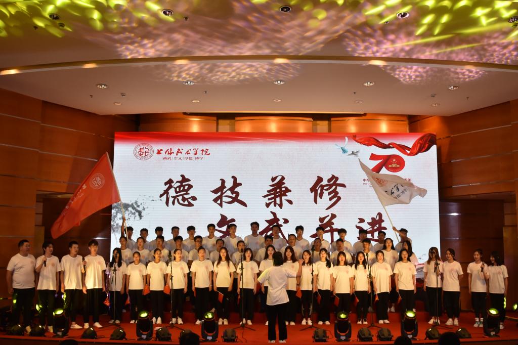 “没有共产党,就没有新中国”,70年前,中国共产党带领全国人民建立了新中国。中国乒乓球学院用《没有共产党就没有新中国》和《国家》唱出了绿瓦学子对党和祖国的热爱;体育教育训练学院带来《让我们荡起双桨》和《我的中国心》以及精彩的艺术体操表演,“民族大团结”的表白发出了爱我中华的共同心声。