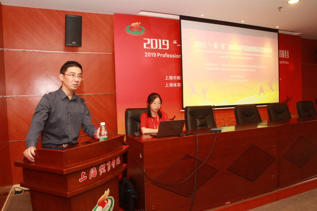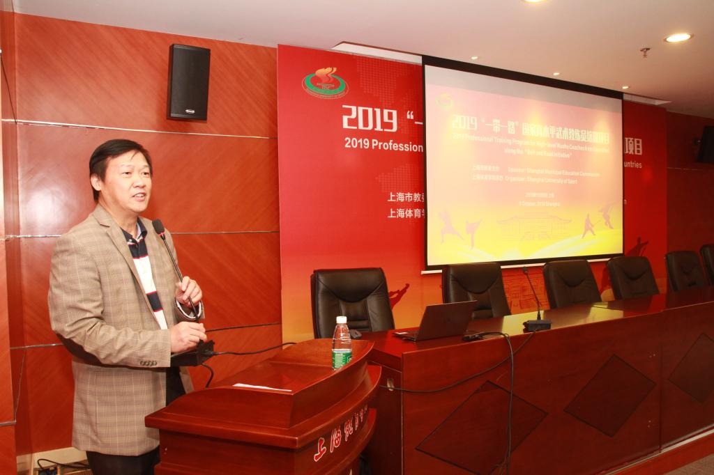 吴贻刚致开幕辞。他提到,“武术是中国的传统文化,也是一项全球化的体育项目,希望来自各地的教练们通过项目加强交流。武术本身是项身体艺术,在中国传统文化中有很长的历史,能促进人的身心教育。在本次培训项目中,希望学员之间加强交流,了解上海,享受上海。吴贻刚宣布2019“一带一路”国家高水平武术教练员培训项目开始。