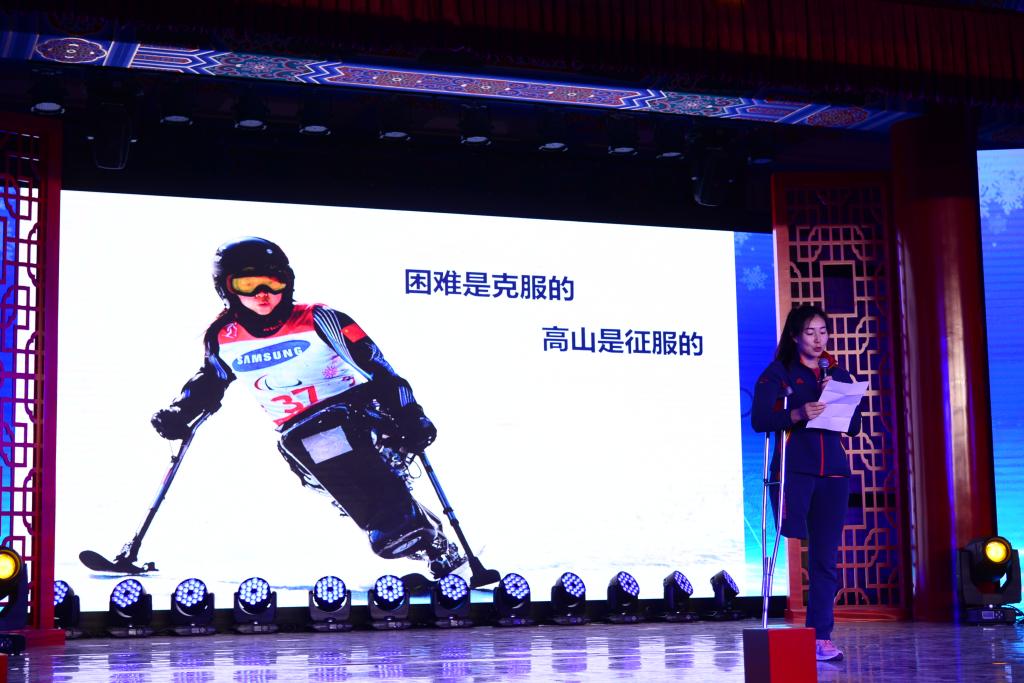 国家冬残奥高山滑雪队队员刘思彤首先与大家分享了自己的运动生涯。性格爽朗又极爱笑的她是个地地道道的东北姑娘,因为四岁那年一场不幸的车祸失去了右腿。不服输的性子和乐观的天性让刘思彤与体育结缘,成为一名残疾人运动员。作为辽宁省手摇自行车队成员,她先后获得了2011年全国第八届残疾人运动会、2015年全国第九届全运会手摇自行车项目45公里大组赛冠军的好成绩。但她不愿止步于全运会成绩,想要尝试不一样的项目,因而又加入了残疾人高山滑雪国家队。此后,她投入百分百精力去训练,不断挑战、证明自己,最终取得了世锦赛小回转第六名、新西兰南半球杯超级大回转和大回转、小回转第一名的优异成绩。在2018年平昌冬残奥会,她还获得了高山滑雪比赛女子回转(坐姿)第六的中国历史最好成绩。