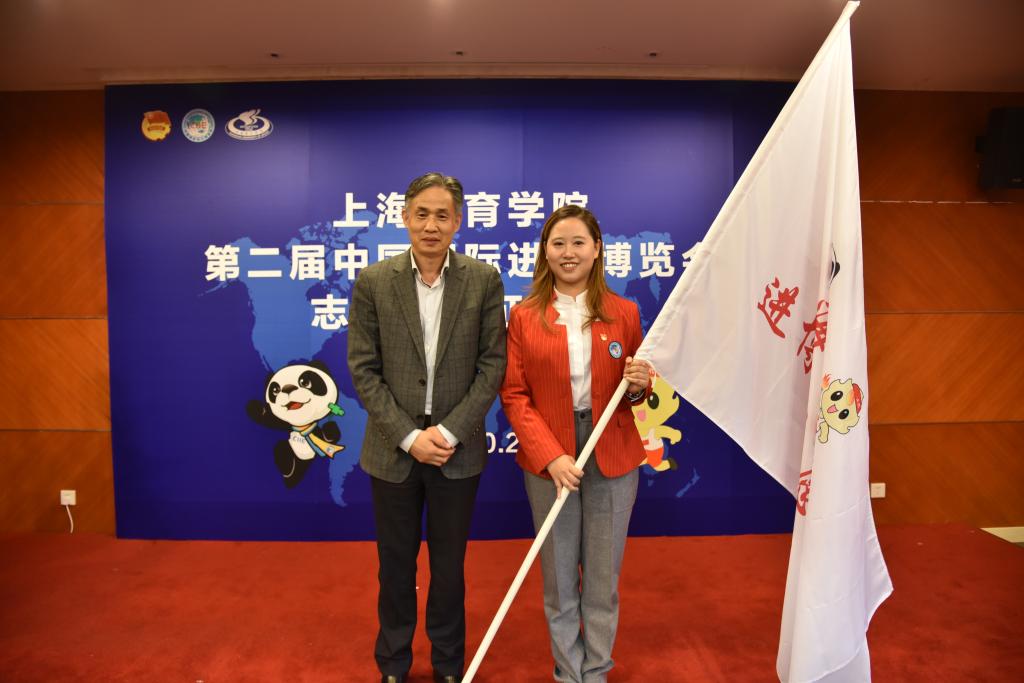 教师志愿者汤含雨代表第二届进博会全体志愿者接受总队旗帜,“向前进,博青春,为进博,一起来”,随着印有小火炬的志愿者旗帜在空中挥舞,标志着红足一1世第二届进博会志愿者服务总队正式成立。