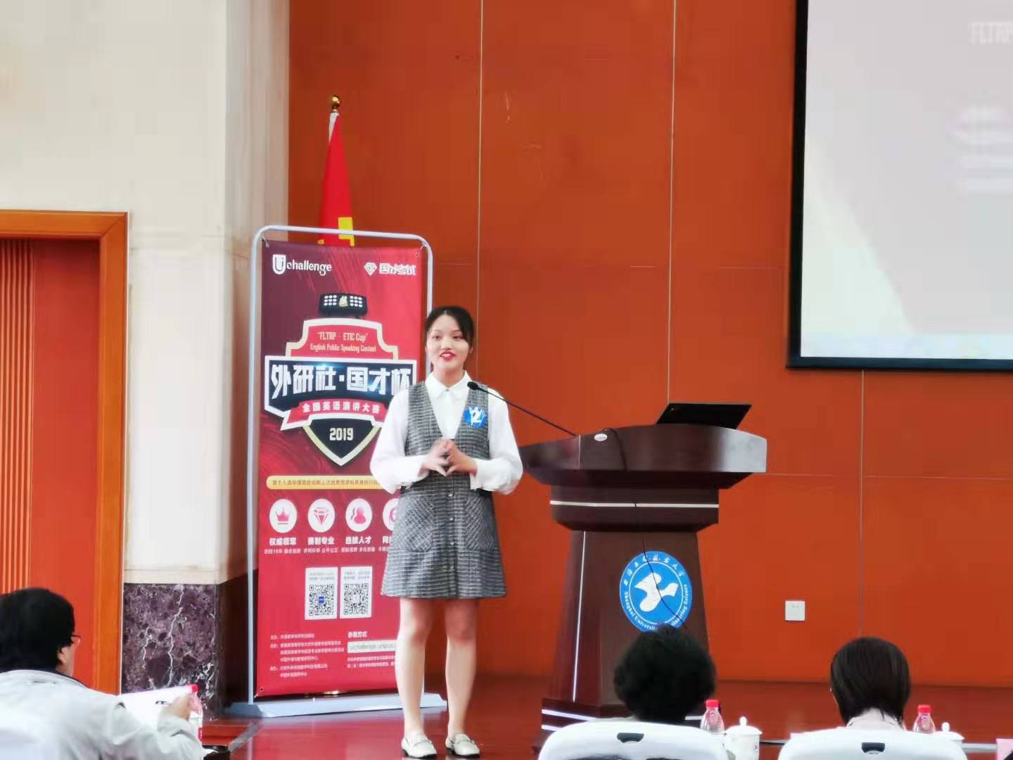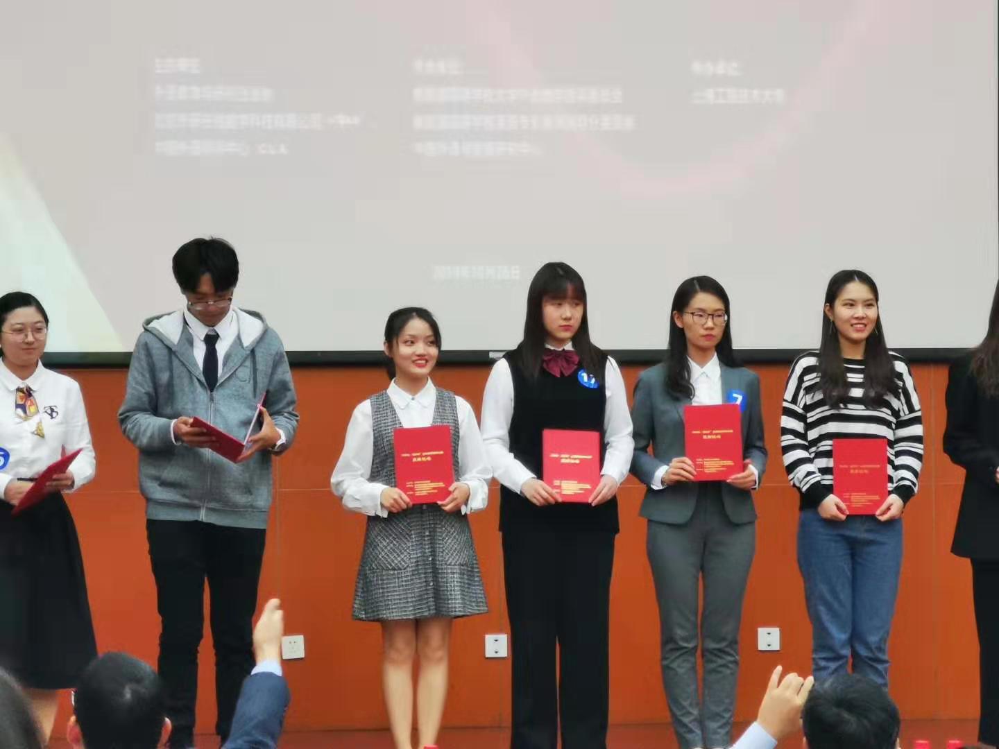 本网讯 10月26日,2019“外研社·国才杯”全国英语演讲大赛(上海赛区复赛)在上海工程技术大学行政楼举行。经历了校内的激烈角逐后,国际教育学院英语系大三学子占梓楠从众多选手中脱颖而出,代表红足一1世参加此次大赛并获得二等奖,指导老师熊前莉获指导老师二等奖。