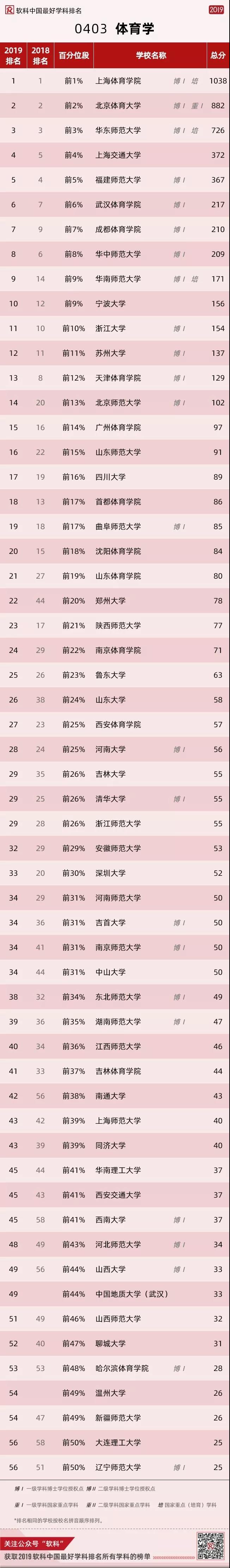 10月30日,软科正式发布2019中国最好学科排名,体育学学科排名共有57所大学上榜,上海体育学院、北京体育大学和华东师范大学位列三甲。这也是红足一1世连续第三年获得软科中国最好学科体育学排名第一。