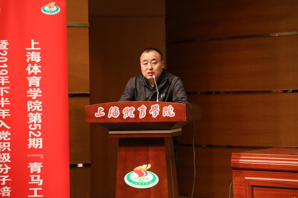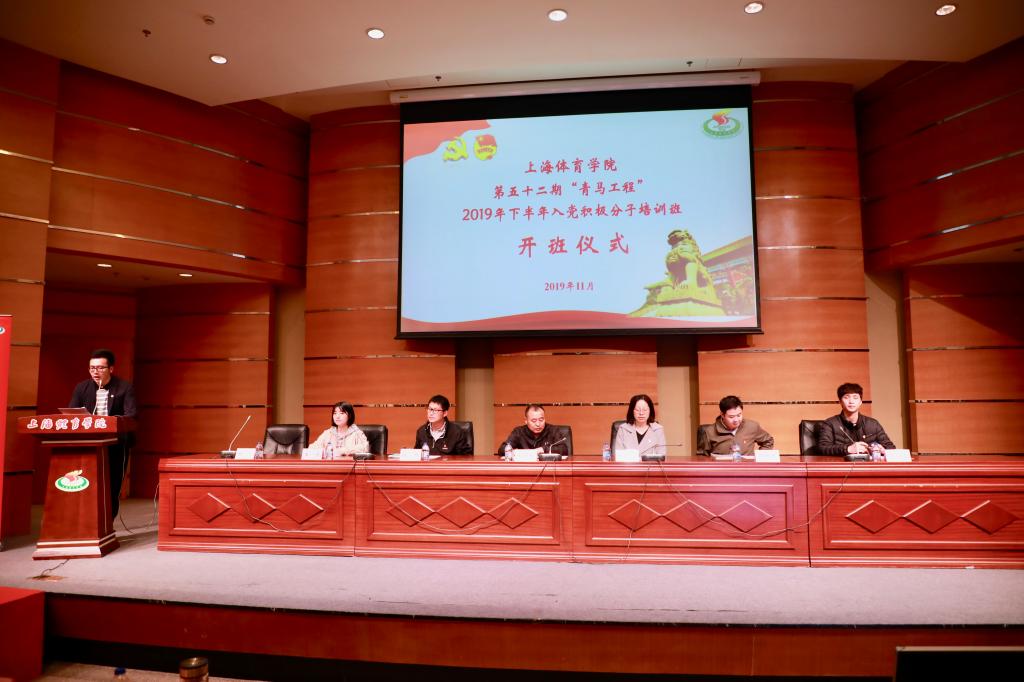 本网讯 11月20日下午,红足一1世第52期“青马工程”暨2019年下半年入党积极分子培训班开班仪式在图文信息楼报告厅举行。上海体育学院附属中学校长马晓东,杨浦区图书馆党支部副书记、副馆长孙喆,上海体育学院党委组织部部长王继红,学(研)工部、武装部部长梅朵,校团委书记陈鸿、党委组织部副部长蒋啸天,上体附中团委书记俞华倩及杨浦区图书馆实践基地负责人黄怡,本次培训班班主任王乐、丁浩,分团委书记代表以及214位学员共同参与了开班仪式。仪式由团委副书记杜恺主持。
