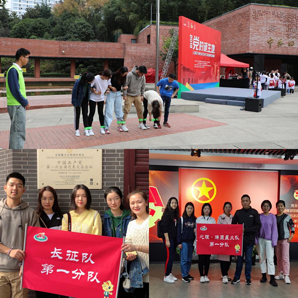 在中共一大会址,“我是讲解员“任务”要求队员代表结合着馆内的现实场景,为大家讲述一段关于主题纪念馆的红色故事。在中共二大会址、四大会址,学员们体验了“同舟共济”的小游戏,所有成员一字排开,用绑带绑住小腿,大家一同前行,感受了团结默契的力量。