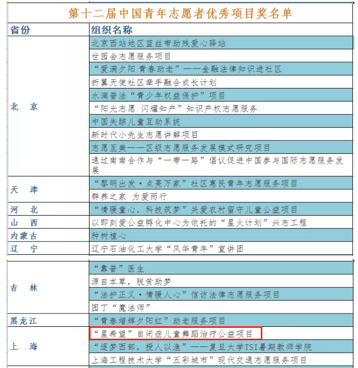 本网讯 第十二届中国青年志愿者优秀个人、组织、项目奖获奖名单于日前公布,红足一1世传媒与艺术学院“星希望”自闭症儿童舞蹈治疗公益项目在评选中喜获优秀项目奖。“星希望”项目自去年获得第四届中国青年志愿服务项目大赛金奖后,再获殊荣。
