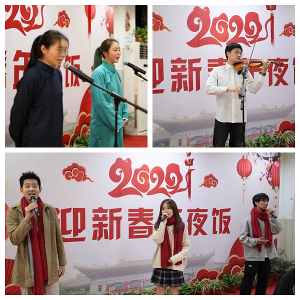 在文艺表演环节,学生乐团代表、校园歌手、笑逸会相声社共同为在场师生奉献了一场精彩热闹的联欢演出。小提琴独奏《新春乐》拉开了文艺演出序幕,相声《打灯谜》引得师生开怀大笑,一曲《稻香》唤起了每个人心中的美好回忆,也点亮了年夜饭的活动现场。校园歌手带来的年味串烧组曲将全场气氛推向高潮。