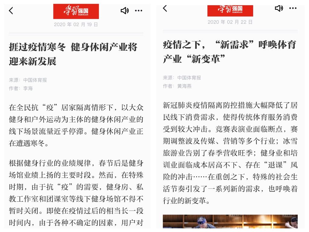 专题文章一经发表受到广泛关注,总阅读量近万次,转载近千次。自2月19日起,《中国体育报》头版连载专题系列中的9篇文章,分别是李海教授撰写的《捱过疫情寒冬,健身休闲产业将迎来新发展》、黄海燕教授撰写的《疫情之下,“新需求”呼唤体育产业“新变革”》、杨倩教授撰写的《疫情对赛事经济影响深远 企业应早谋划应对策略》、刘东锋教授撰写的《新冠疫情下体育用品业的危与机》、陶倩教授撰写的《面对“宅”经济,体育企业应该有“智慧”》、宋昱老师撰写的《新冠疫情促动体育产业的资源协同与运营创新》、齐超老师撰写的《城市应急与生命之舱:疫情下的体育场馆今后路向何方》、段艳玲老师撰写的《应对市场变化,体育企业应提高危机管理能力》和张叶涵老师撰写的《体育企业应“五稳五新”过难关求发展》。截至目前,该系列专题文章已完成刊载6篇,反响热烈。