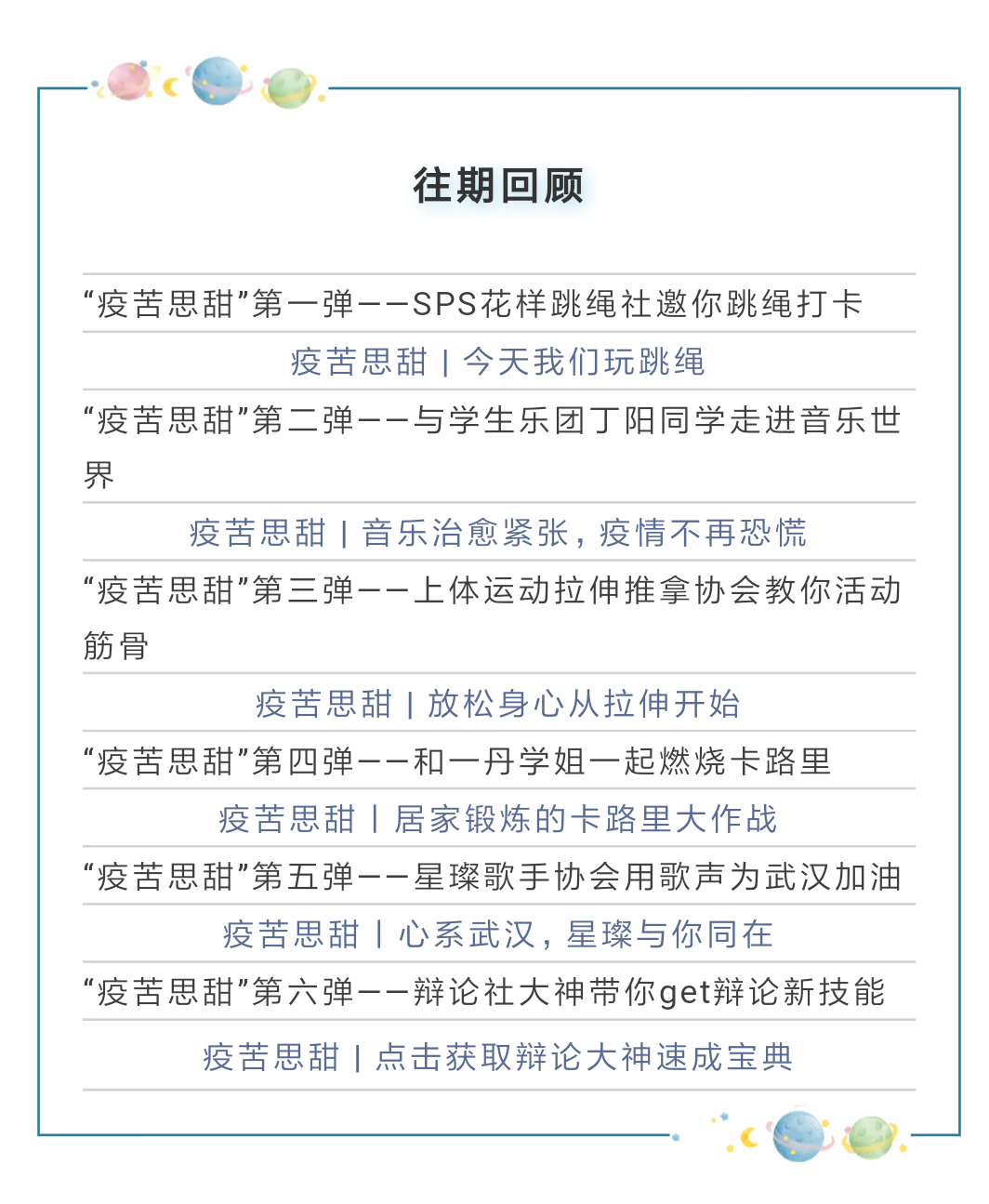 校团委面向广大团员青年、各级团组织、各级学生会、学生社团等推出“身心战疫,竞攀同行”线上团日活动,并在SUS青年、上海体育学院学生会等微信平台推出宣传专栏。SUS青年积极参与“青年大学习”团员理论学习活动、 “青年返乡报到”志愿服务活动、“21天线上打卡”活动、征集宣传“SUS青年战‘疫’”创意分享活动,推出了“疫苦思甜”系列专栏,一次次特殊的主题团日活动正通过网络在全校各级团组织中深入展开。全校共青团员在开展“青年大学习”网上主题团课,学习贯彻习近平总书记关于疫情防控的重要指示精神,并积极交流讨论学习体会,共同坚定信心、科学防护。