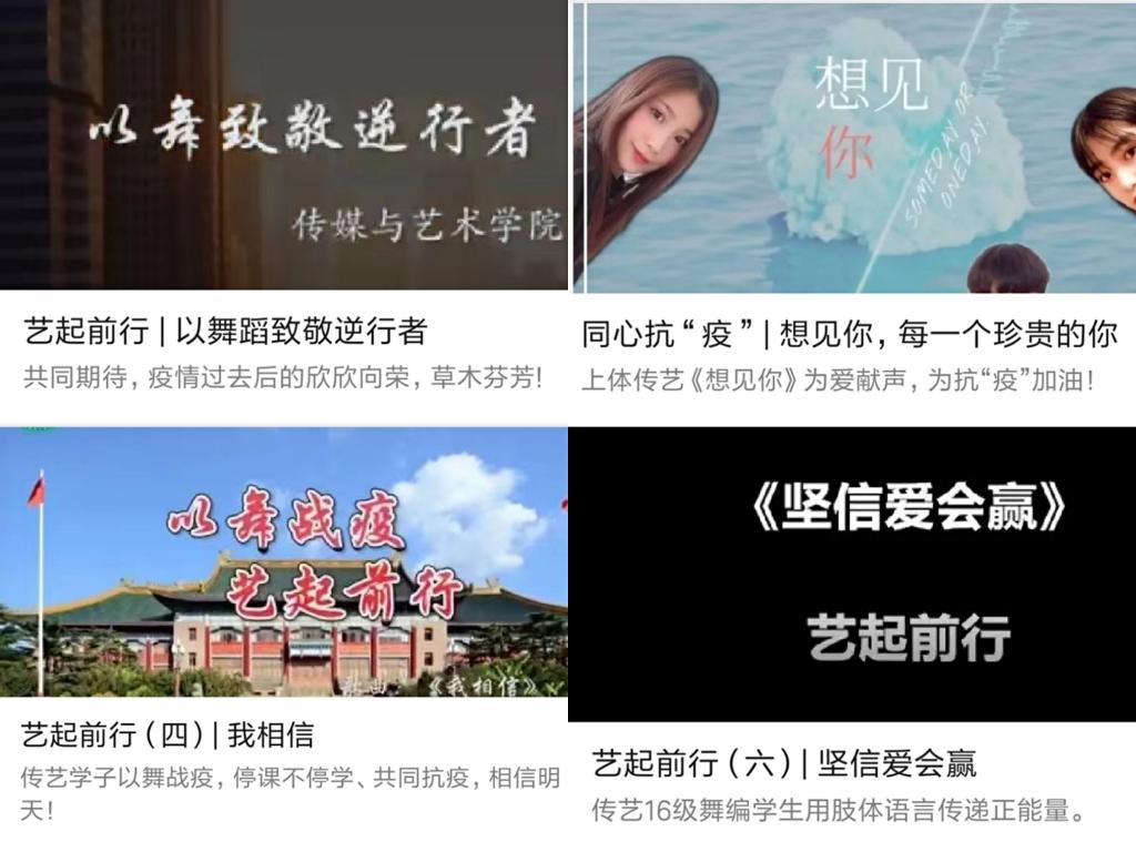 各级团组织用原创舞蹈、书画、歌曲等为武汉加油、为中国加油。传媒与艺术学院分团委、学生会改编《想见你》歌词并进行“云”录制,唱响传艺学子共同的心声,为中国加油。162301团支部选择在有限的空间和环境中,精心设计编排《坚信爱会赢》,用肢体语言传递正能量。2月19日,韩磊和佟丽娅发行了祝福武汉的音乐作品《天使的阳光》,182301团支部的同学们就《天使的阳光》展开了舞蹈编创,对武汉表达最真挚的祝福……以“艺”抗疫,传艺师生同心协力创作并进行“云”制作,涌现出一部部优秀的抗疫作品。