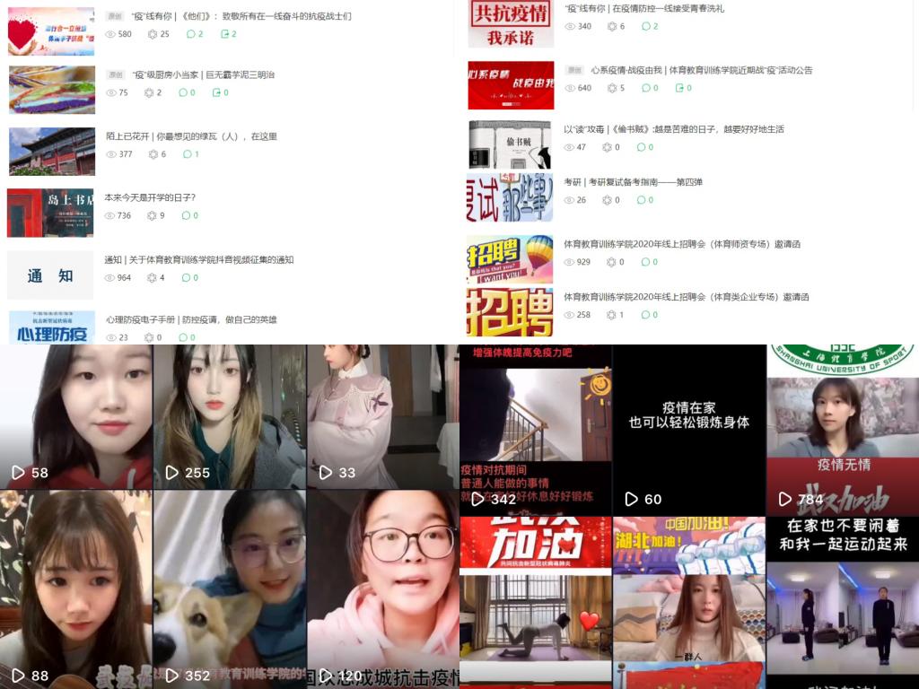 体训学院在积极贯彻学校联防联控工作要求的同时,坚决贯彻“三个全覆盖”“三个一律”“三个强化”工作要求,进一步加大防控力度,严防死守,努力打好防疫攻坚战,立足学科专业优势,依托微信公众号等平台及时发布专业的健身科普和心理咨询推送,服务全市联防联控工作,积极引导师生做科学防控的践行者和健康上体的守护者,展现上体人身心一统的良好形象,相关资讯和内容在《人民日报》、《解放日报》、《文汇报》、《新民晚报》、《新闻晨报》等媒体平台上报道。